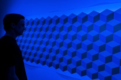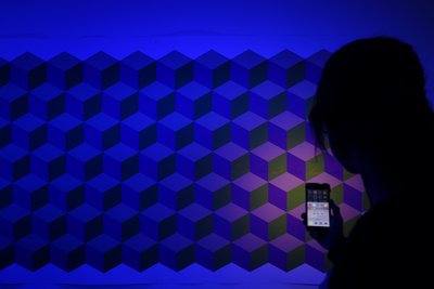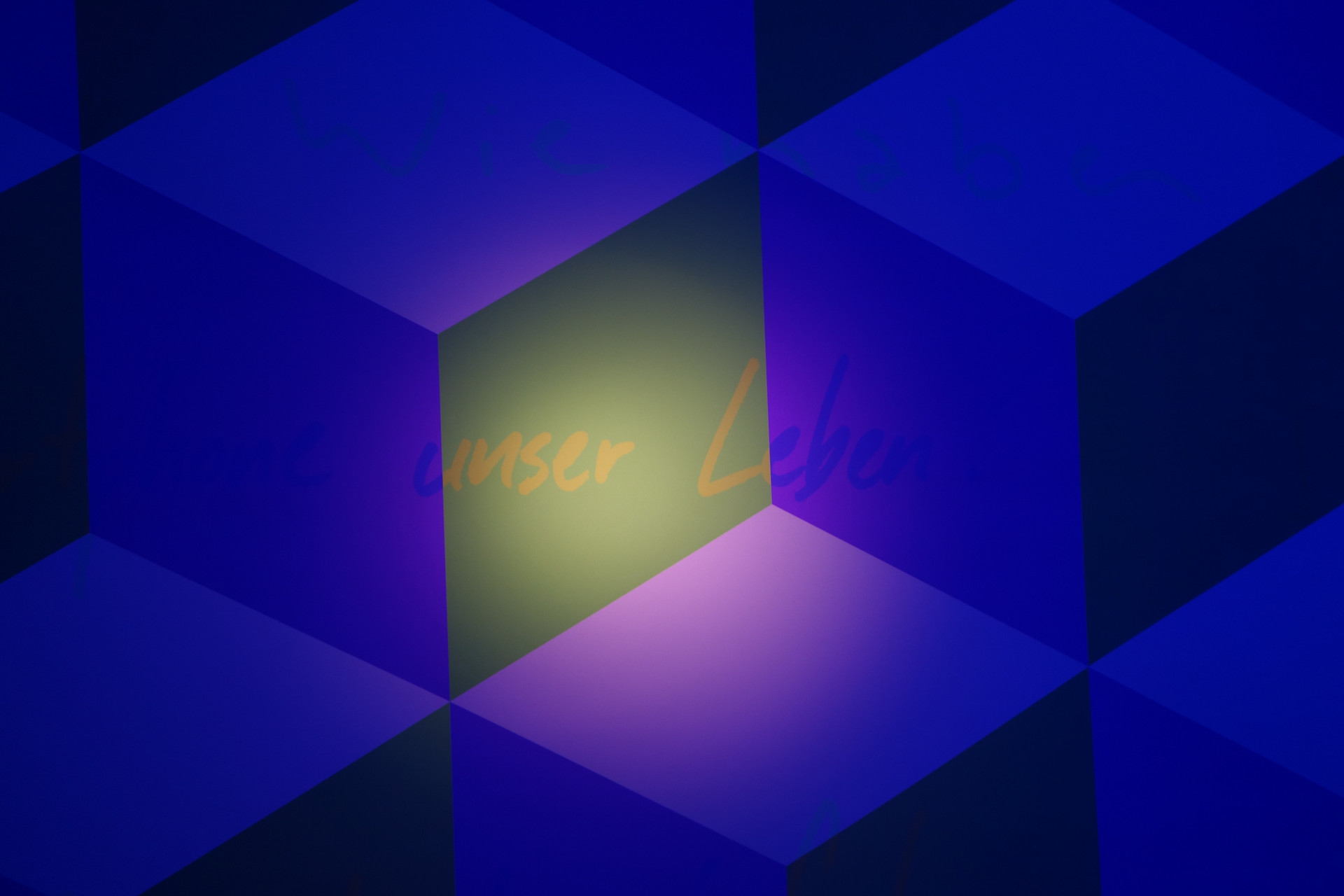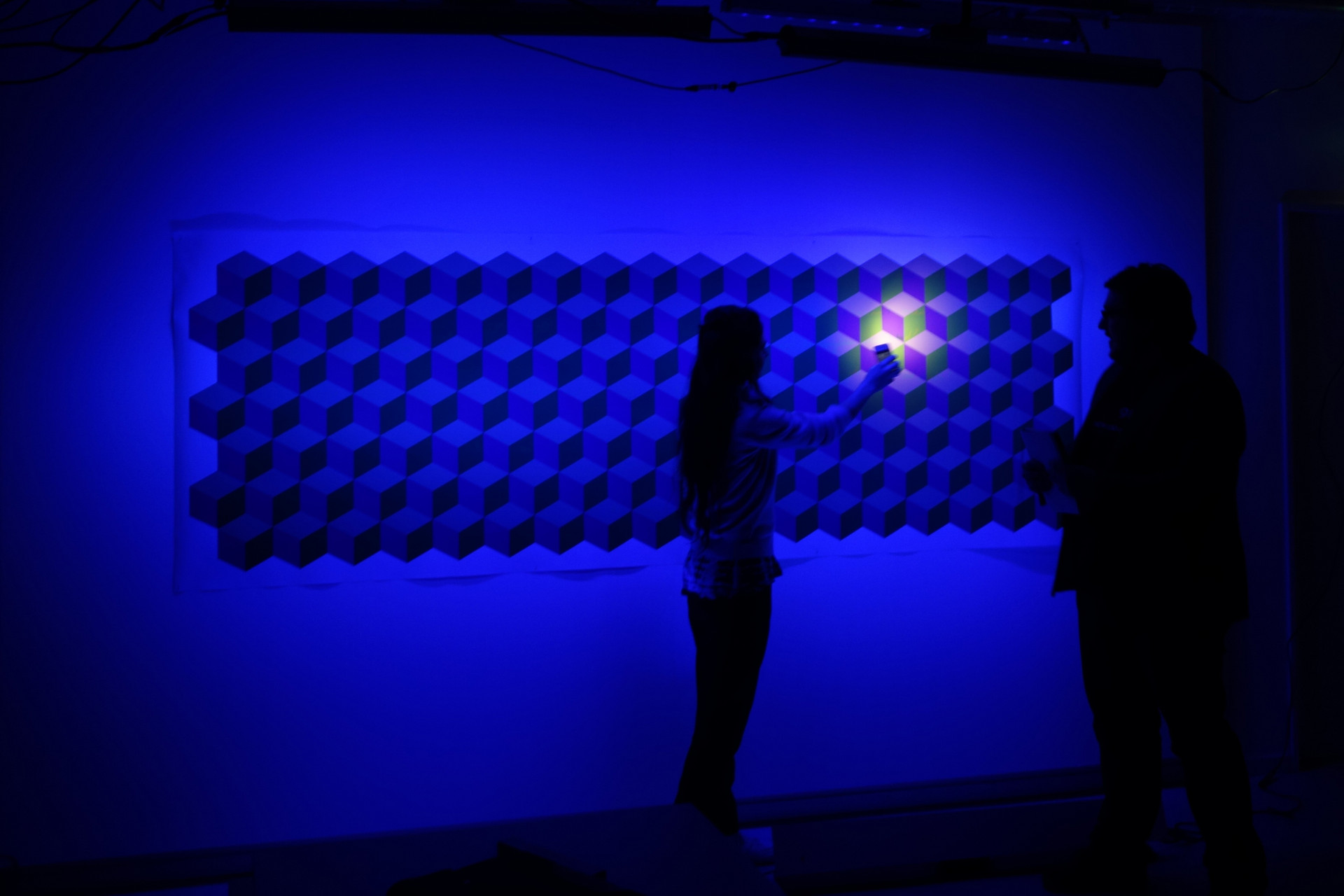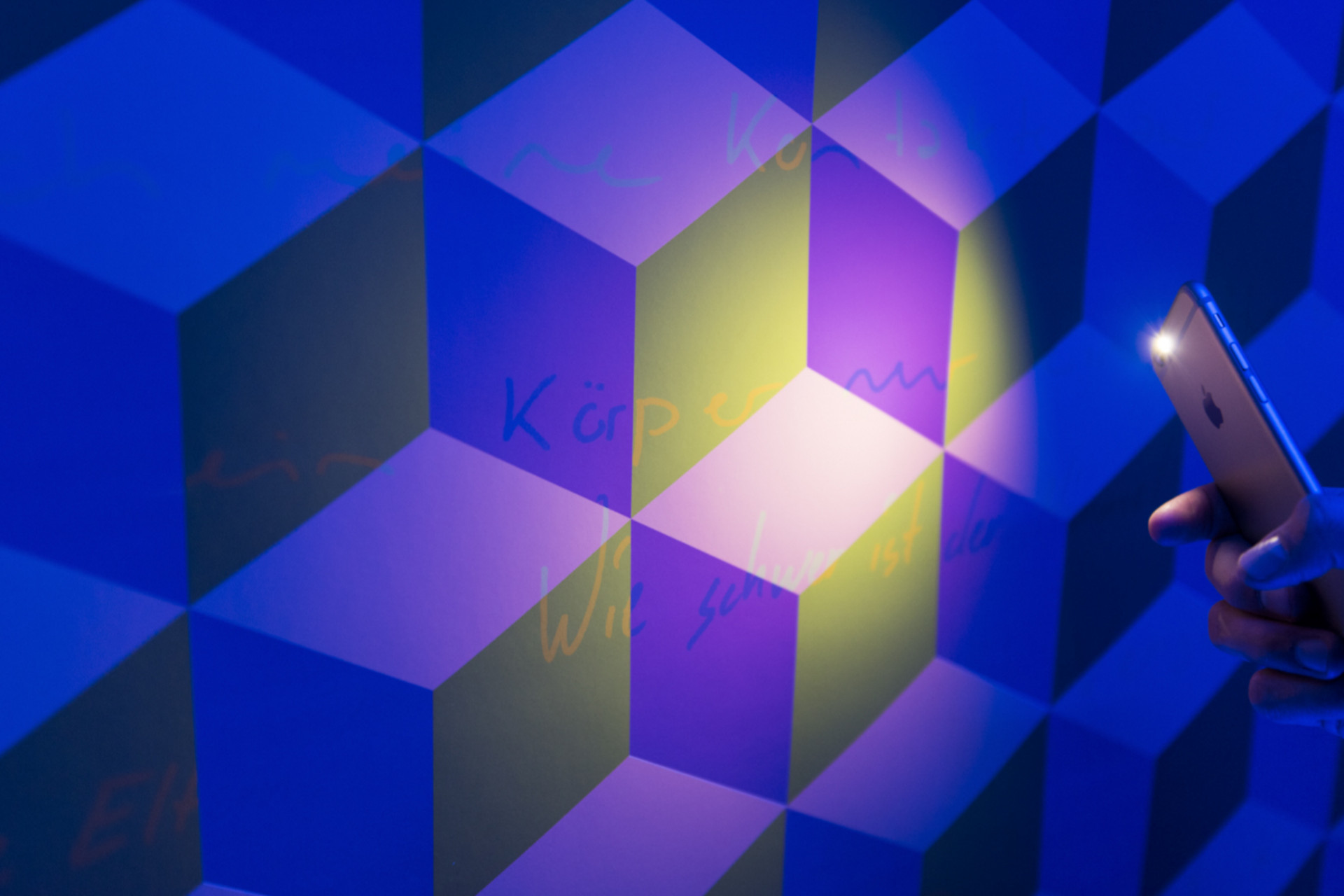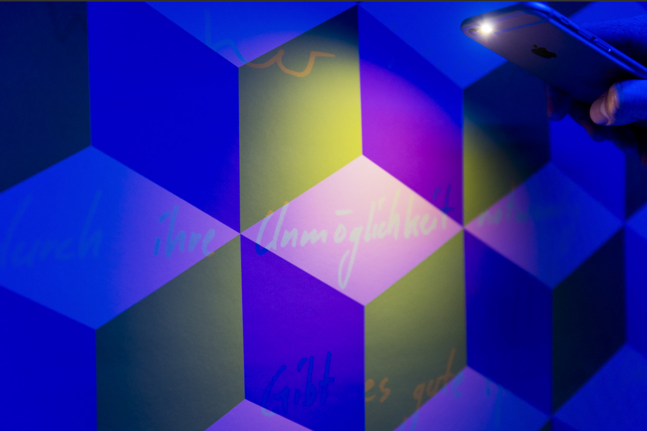 Ein Plakat mit einem graphischem Muster wird mit blauem LED-Licht bestrahlt. Erst wenn man mit einer Taschenlampe das Plakat anstrahlt, werden die Farben sichtbar und man entdeckt darin versteckt einzelne Fragen, die die Besucher zum Diskutieren anregen sollen.