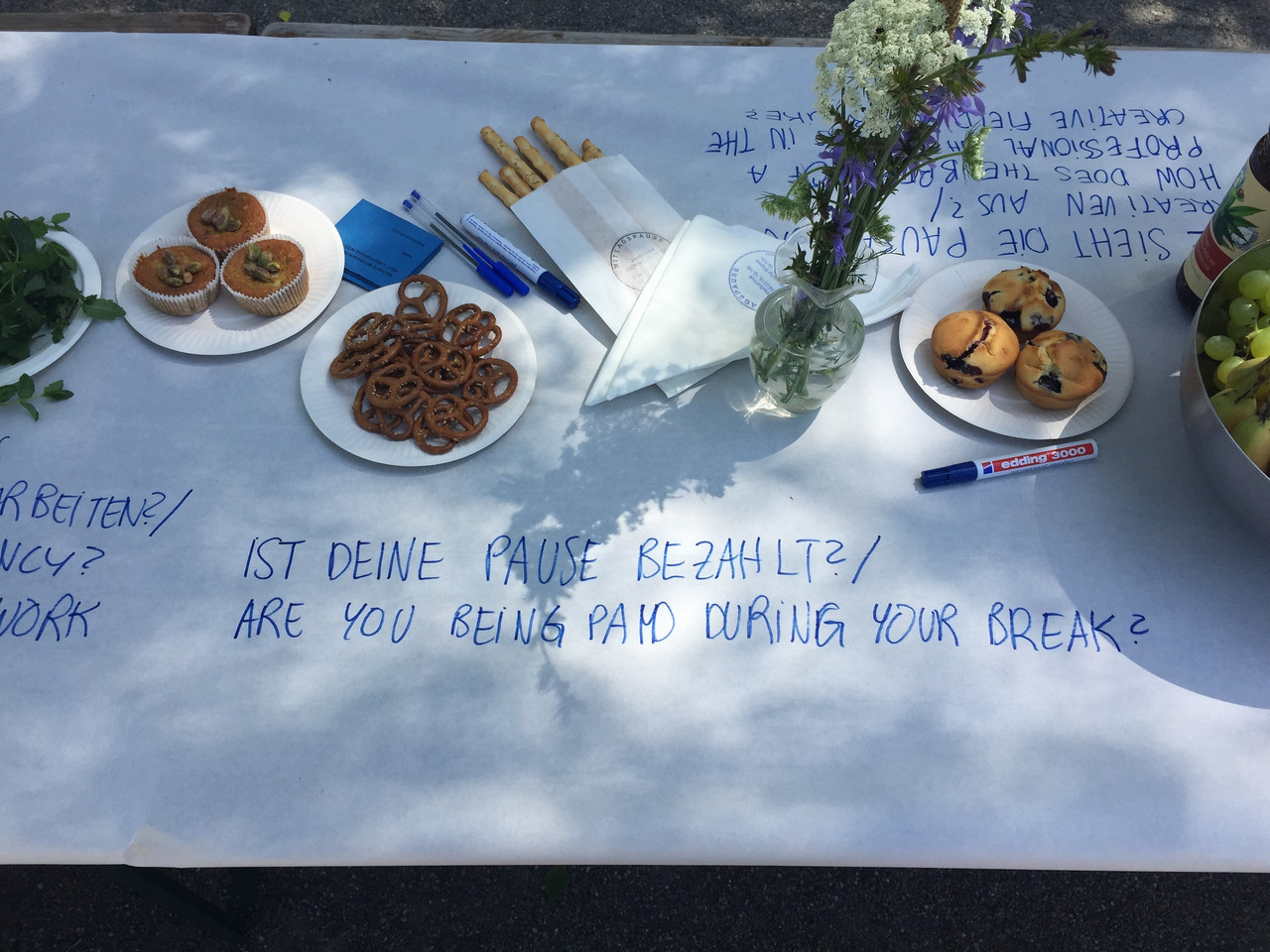 Eine Juristin, zwei Lehrlinge der SBB, eine Beraterin und ein Interaction-Designer unterhalten sich Ende Juni auf der Josefwiese in Zürich über unbezahlte Pausenzeiten, prekäre Arbeitsbedingungen im Kulturbereich und vielfältige Bildungswege. Auch wenn sie im gleichen Stadtteil arbeiten, treffen sie während dieser gemeinsamen «Mittagspause» das erste Mal aufeinander. Ein langer Tisch mit Getränken und frischem Obst bietet an zwei Tagen auf der Josefwiese die Gelegenheit, mit fremden Menschen in Kontakt zu treten und sich während des Mittagessens nicht nur mit den eigenen Arbeitskollegen zu unterhalten.