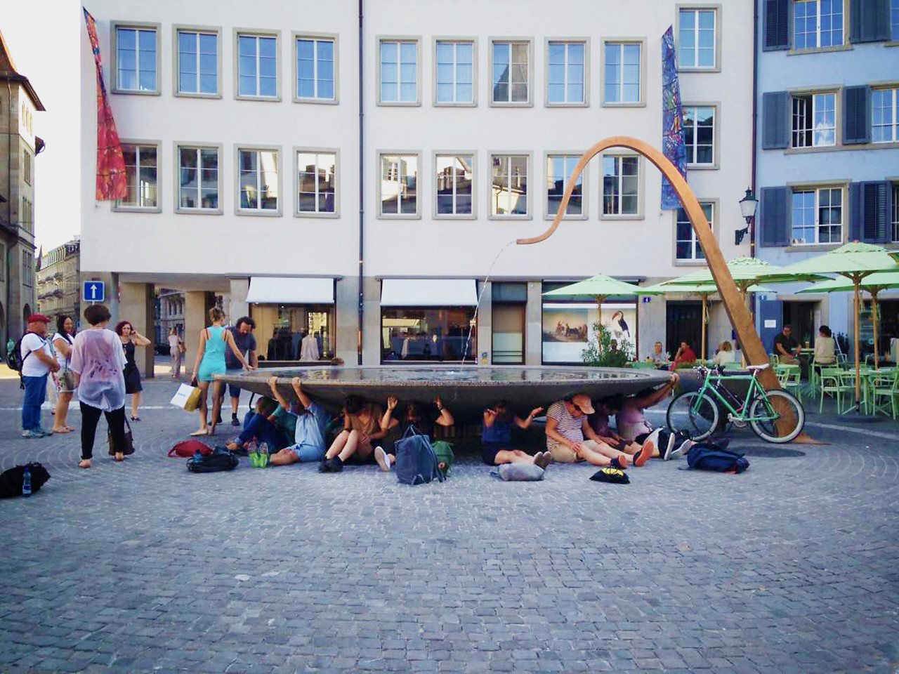 Um Kontakt geht es auch bei der Stadtführung «Spielraum Zürich»: Hierbei erfahren die Teilnehmenden neue Perspektiven und Berührungspunkte mit dem Zürcher Stadtraum. Unter einer Autobahnbrücke sitzen mehrere Menschen und lauschen still den Geräuschen der vorbeifahrenden Autos. Kurz zuvor haben sie sich unter einen Brunnen gesetzt und den urbanen Raum aus einer anderen Perspektive erfahren. Während des gemeinsamen Spaziergangs werden die Teilnehmenden aufgefordert, ihr Wissen und ihre Erfahrung mit den Anderen zu teilen und mit ganzem Körpereinsatz die Stadt Zürich neu kennen zu lernen.
