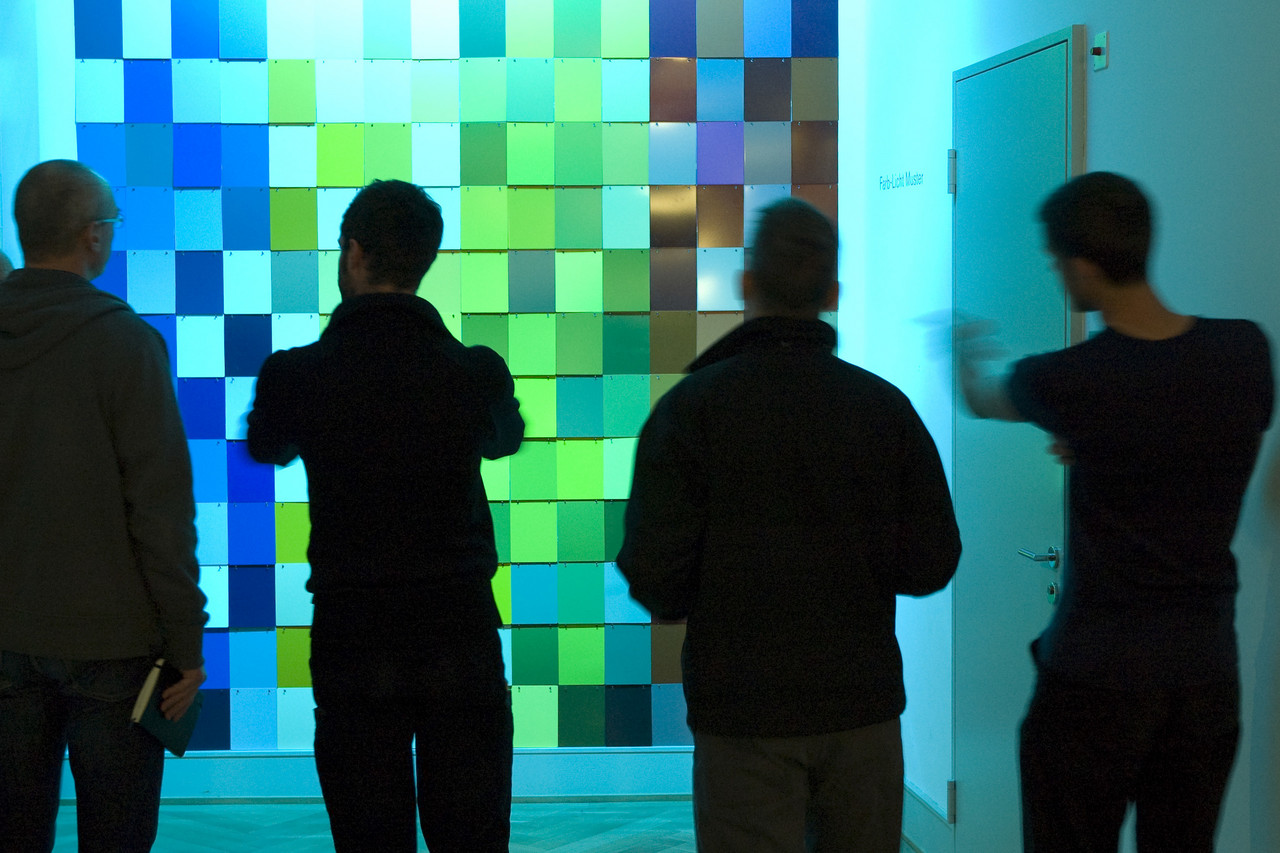 Bei der Wandinstallation Farb-Licht-Muster sind 272 pulverbeschichtete Bleche mit unterschiedlich glänzenden und texturierten Oberflächen, von stumpfmatt bis hochglänzend, in den folgenden vier Farbbereichen vertikal angeordnet: