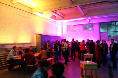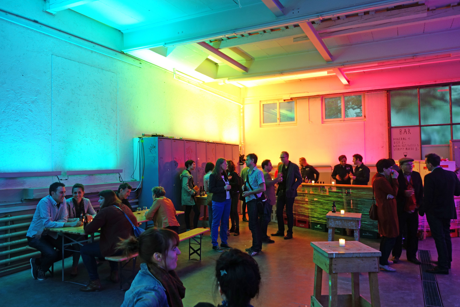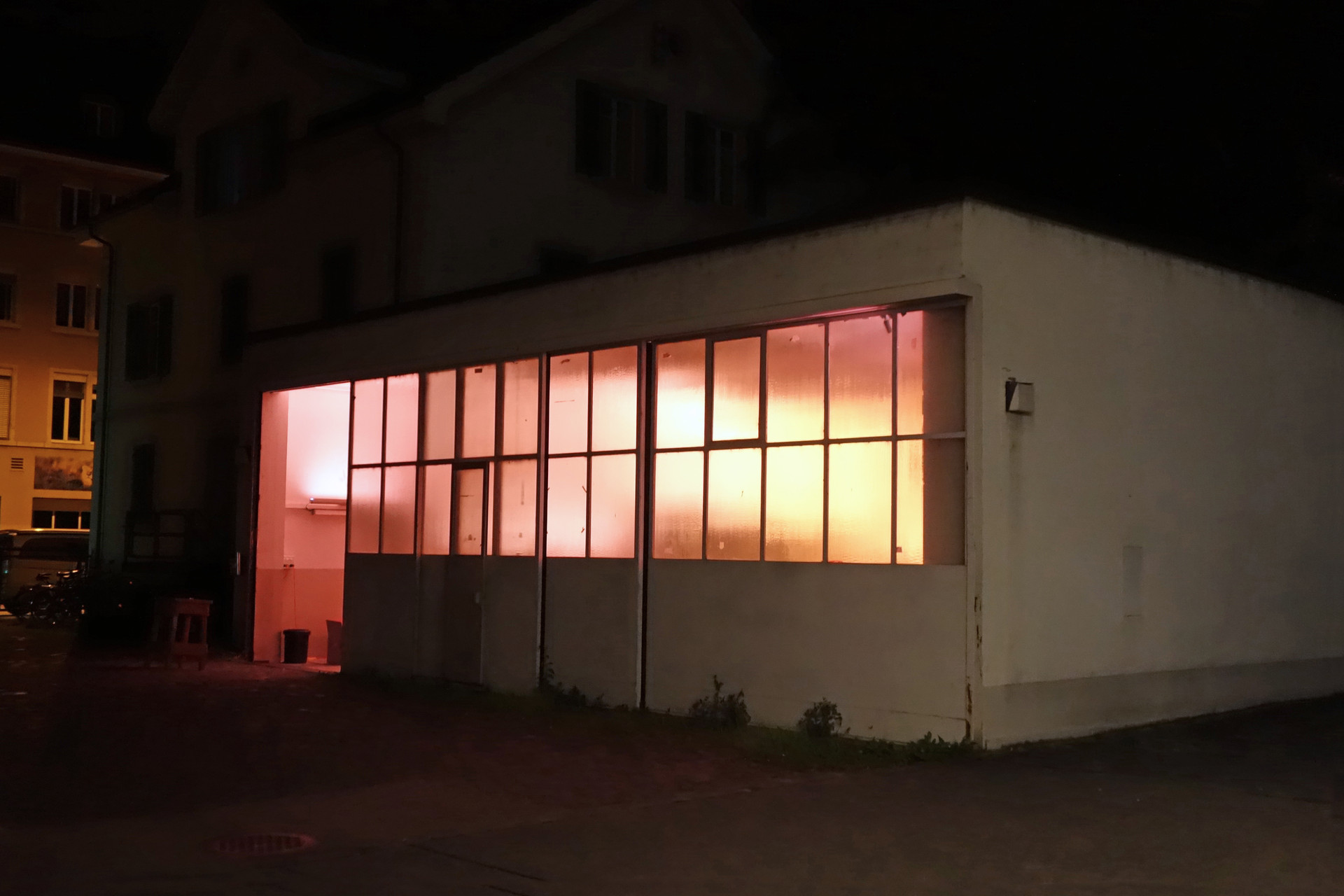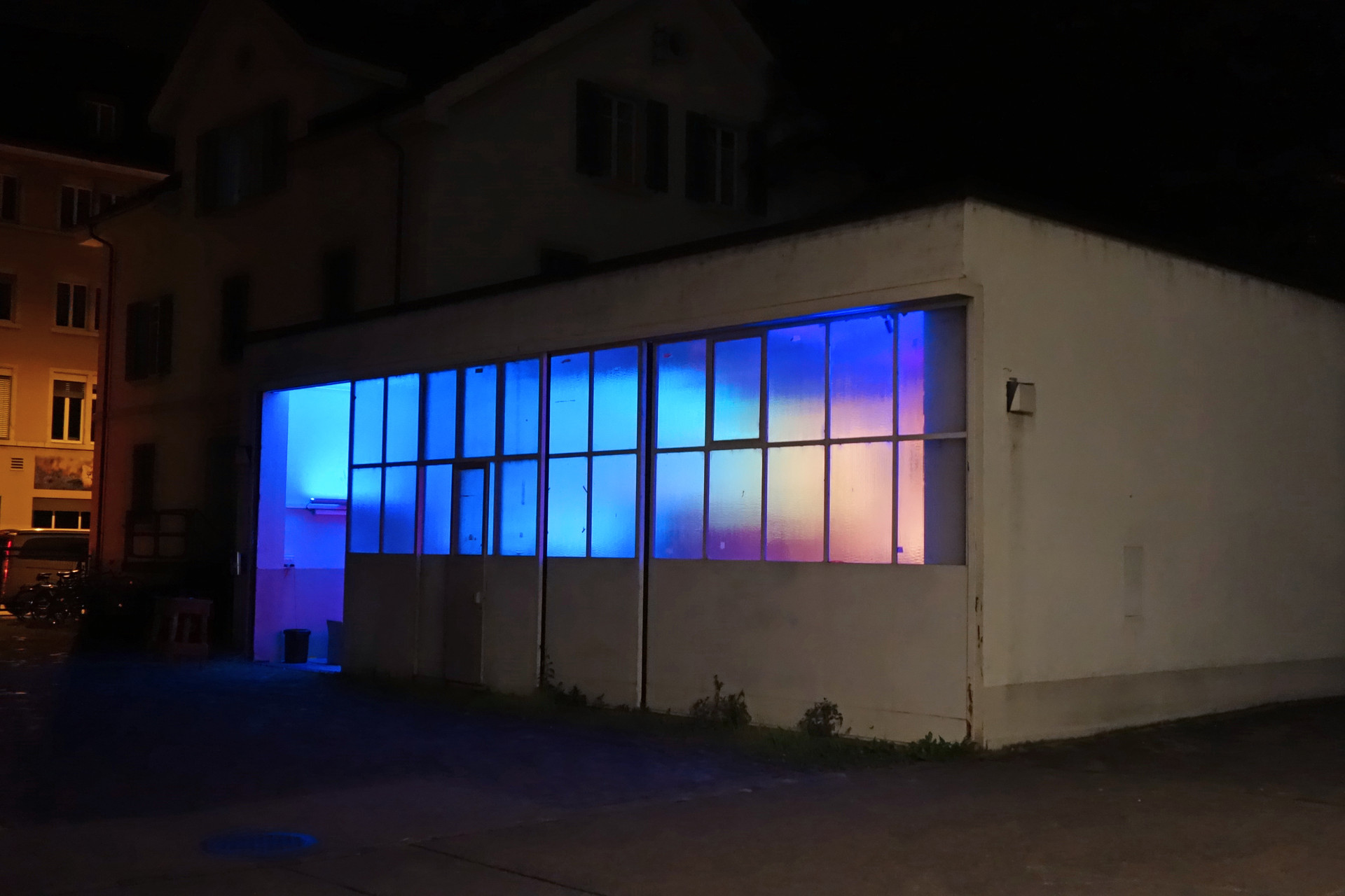 Zwischendurch wechselt die Lichtfarbe und der ganze Raum wird in einen warmen Farbton getaucht. Dabei oszilliert die Farbe langsam zwischen Orange und Gelb. Anschliessend geht das Licht in einer der Raumhälften langsam in cyanfarbenes Licht über, während die ändere Raumhälfte orange bleibt. Wieder fängt das Licht sich kaum wahrnehmbar im Uhrzeigersinn zu drehen - eine Lichtinstallation im Spannungsfeld von Farbe, Bewegung und Wahrnehmungsgrenzen.