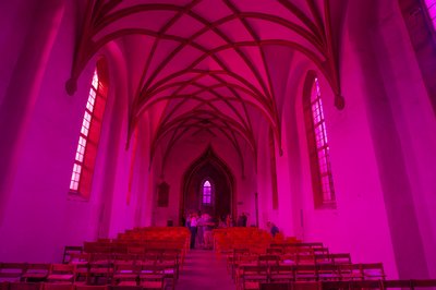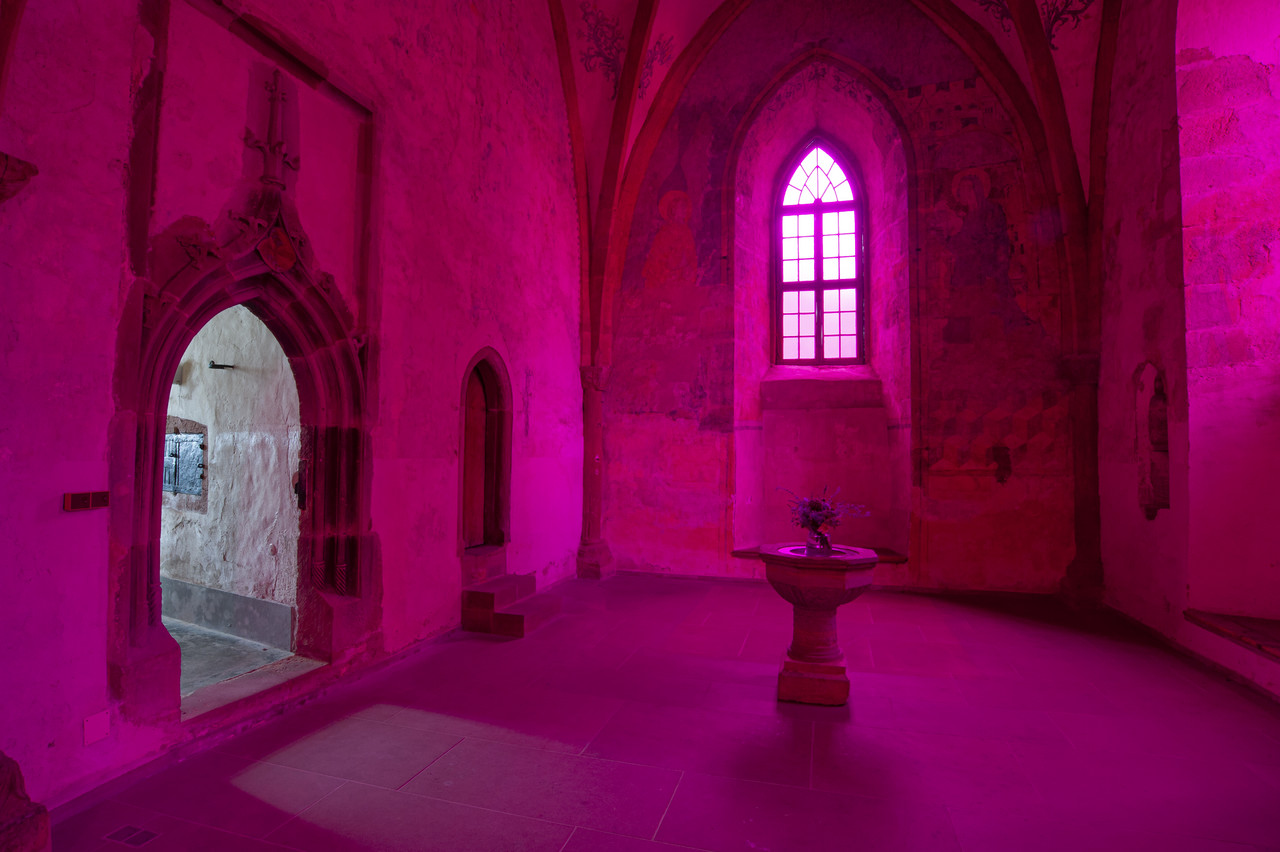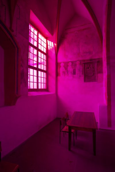 Dieses immersive Farberlebnis eröffnet den Besuchern die Möglichkeit, den architektonischen Raum neu zu erleben und die eigene Farbwahrnehmung zu beobachten und zu hinterfragen. Gleichzeitig nimmt die Installation Bezug auf die Tradition gefärbter Gläser in Sakralbauten.