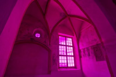 Mit Hilfe von Magenta Farbfiltern (LEE 332) wird das Tageslicht gefiltert und der ganze Raum intensiv eingefärbt.