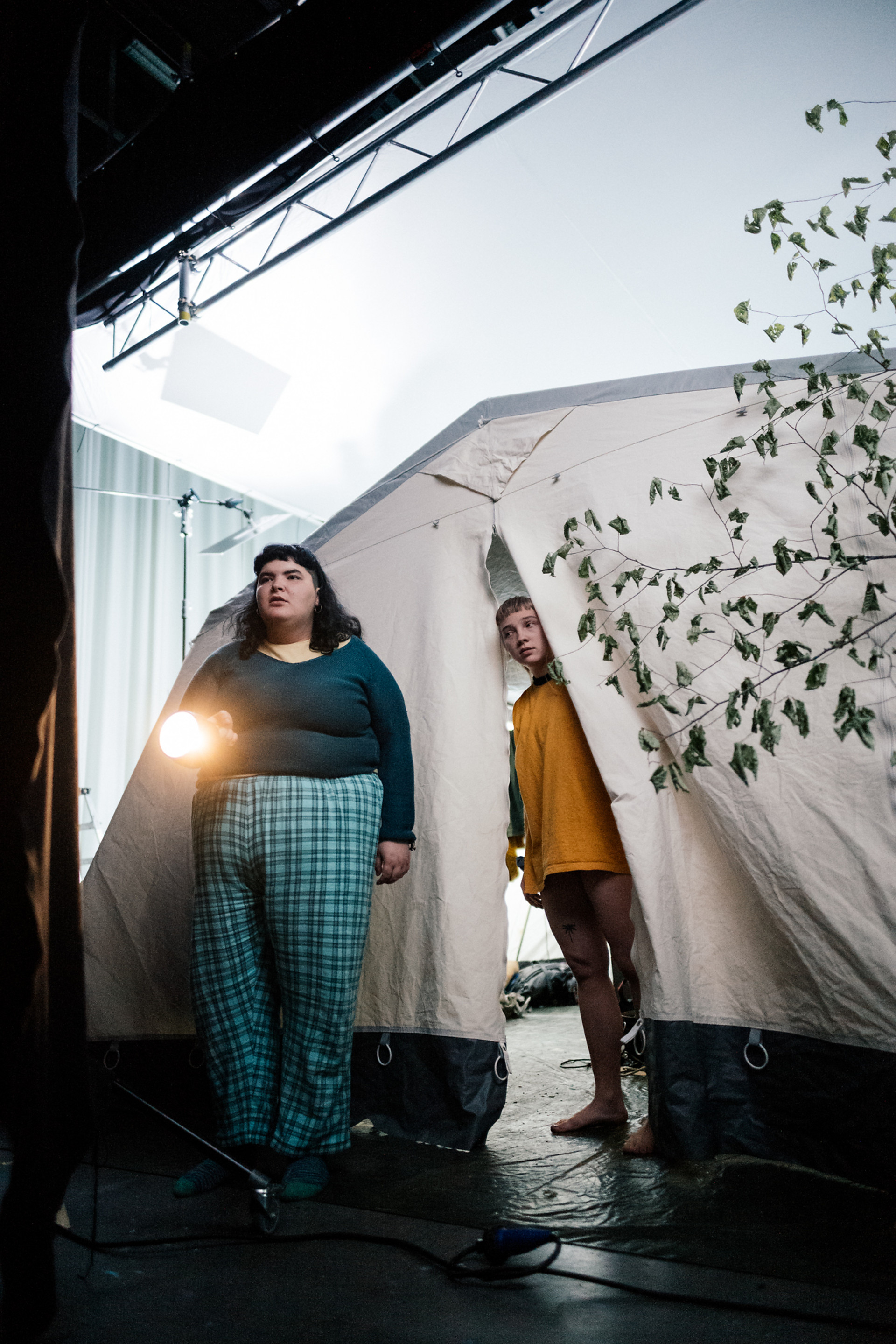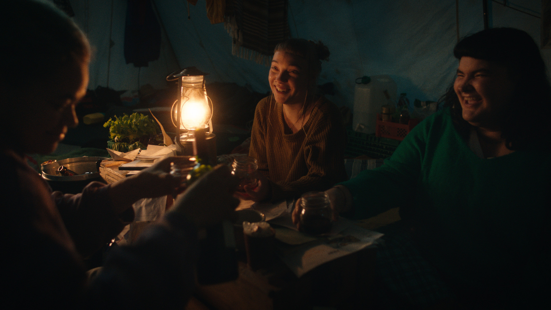In einem leeren Zeltcamp schrecken drei Leiterinnen aus dem Schlaf. Sie hören Hundegebell, fremde Stimmen und plötzlich brennt ein Zelt. Sie sehen nach, was vor sich geht und entdecken im Licht der Flammen eine Gruppe vermummter Randalierer. Sie fordern die Vermummten auf zu verschwinden, doch flüchten sich ins Zelt, als diese sie beschimpfen und bedrohen. Im Inneren des Zeltes gehen die Frauen unterschiedlich mit der Situation um. Ein Anruf bei der Polizei, dann sind die drei auf sich selbst gestellt.