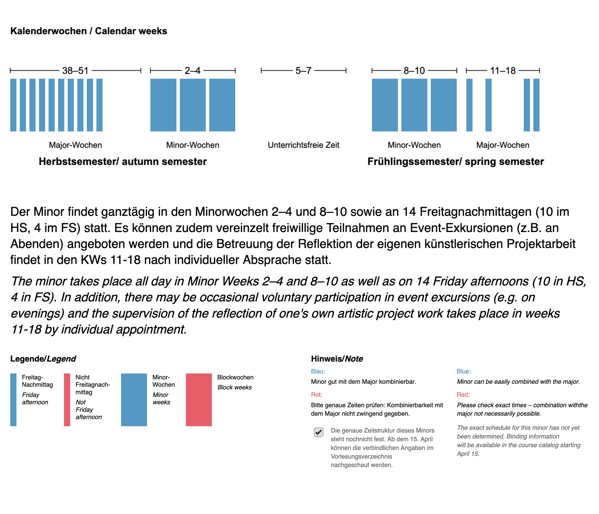 Der Minor findet ganztägig in den Minorwochen in der KW 2 bis 4 und KW 8 bis 10 statt und wird während des Semesters an den Freitagnachmittagen fortgeführt.