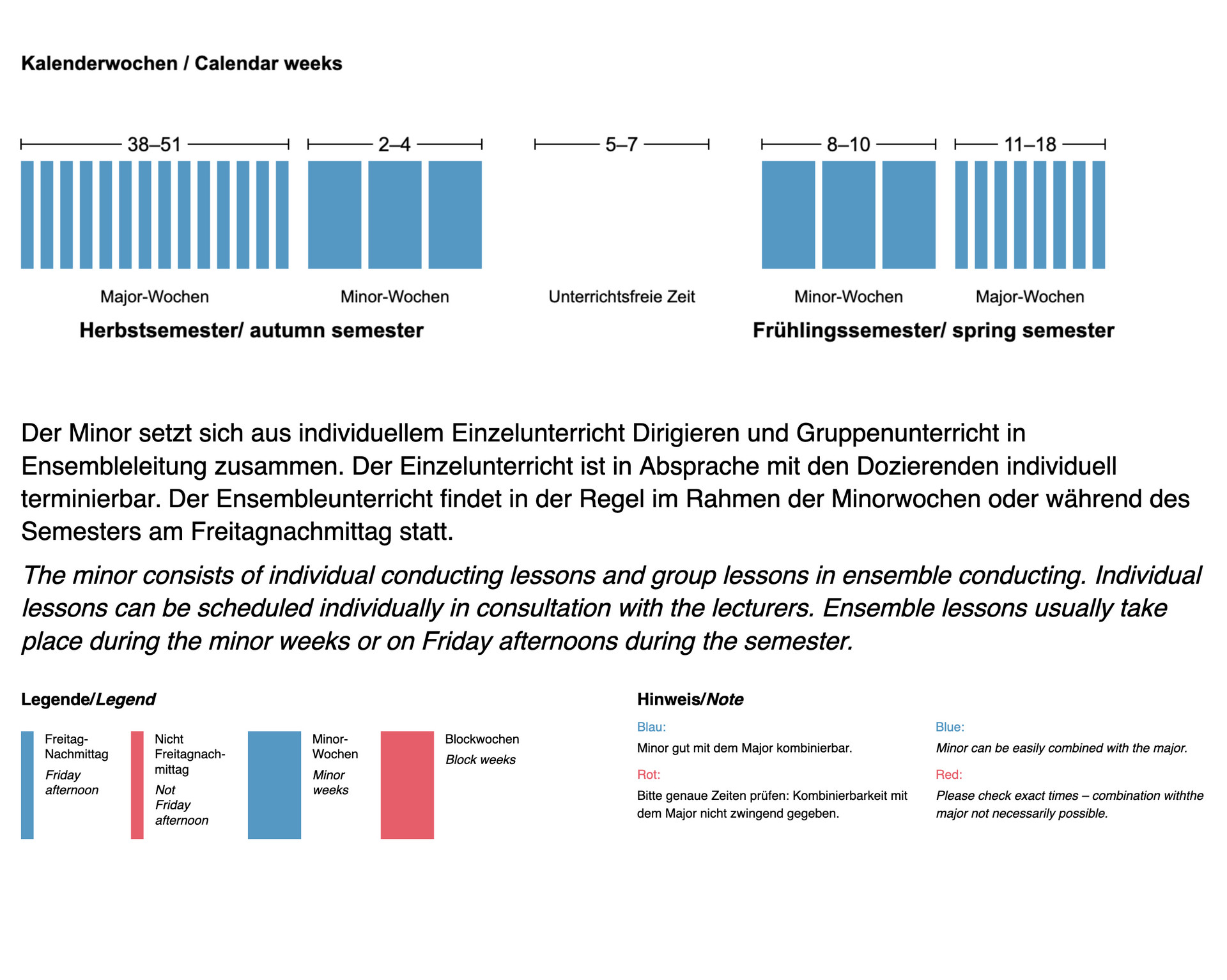 Für diesen Minor besteht ein Kontingent an Einzelunterricht von 28 x 30 Minuten und Klassenstunden in Ensembleleitung mit 8 aktiven Sequenzen. Die Unterrichtstermine und die Einteilung in die Klassenstunden sind individuell und in Absprache mit den Dozierenden planbar.