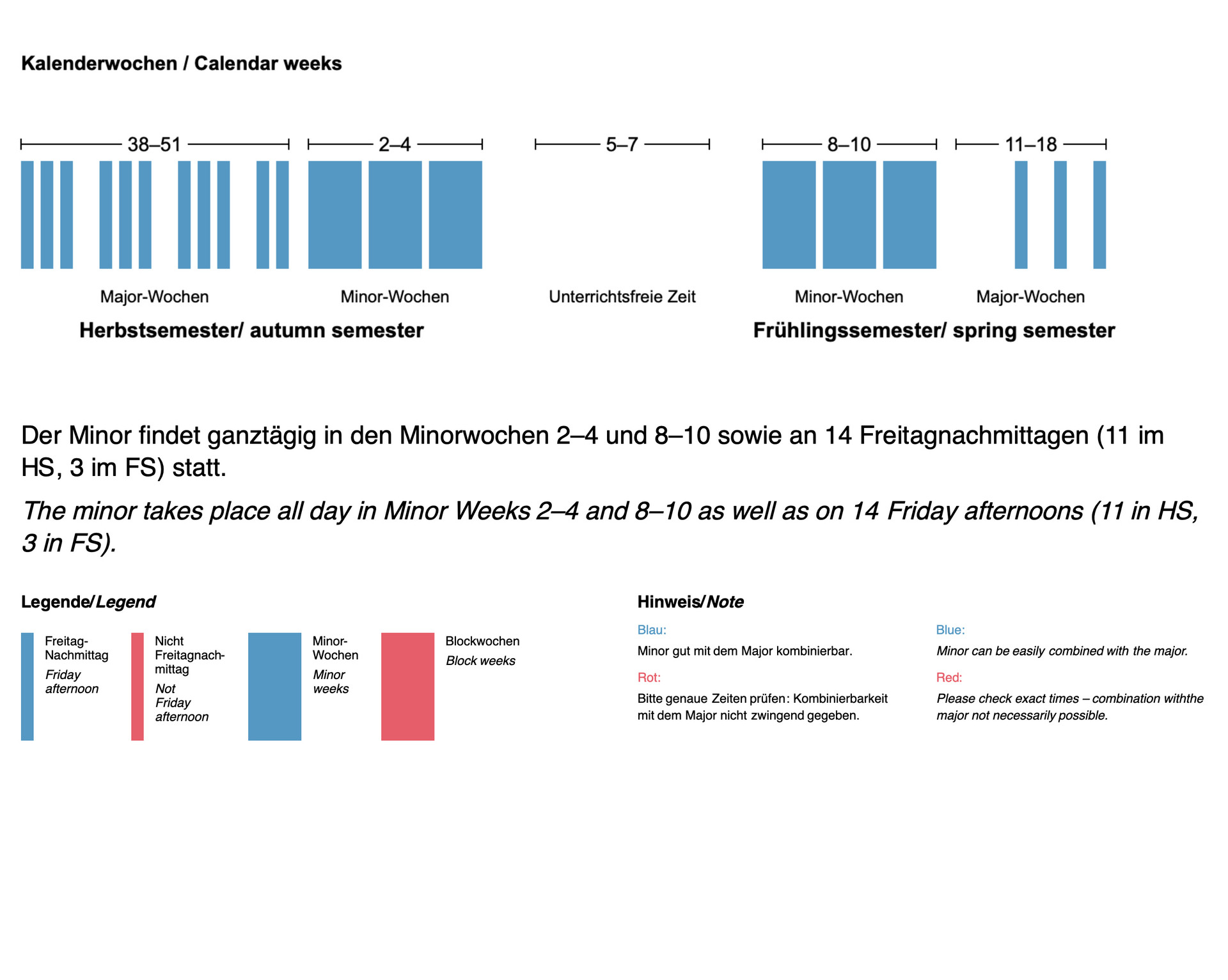 Der Minor findet ganztägig in den Minorwochen in der KW 2 bis 4 und KW 8 bis 10 statt und wird während des Semesters an den Freitagnachmittagen fortgeführt.