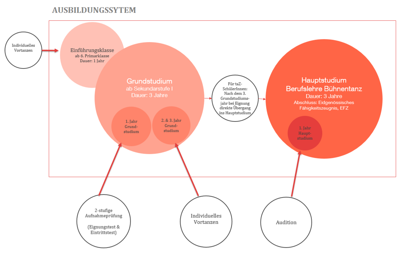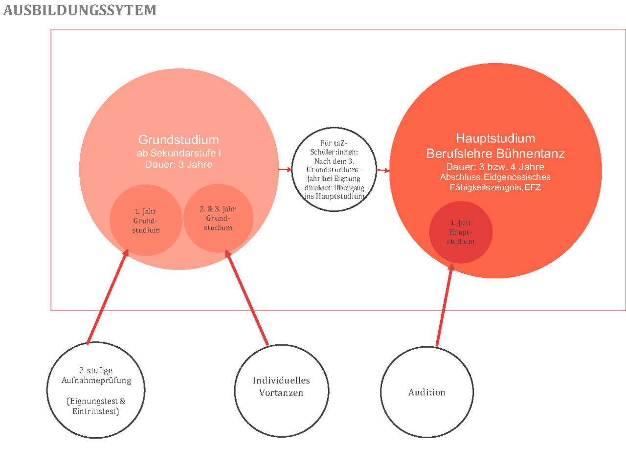 Unsere Schülerinnen und Schüler erwartet ein spezielles, auf die komplexen Anforderungen des heutigen Berufsfeldes ausgerichtetes Ausbildungskonzept. Die Ausbildung ist in zwei Stufen gegliedert. Das Grundstudium ist parallel zur obligatorischen Schulbildung koordiniert. Der Eintritt erfolgt im Alter von 11 bis 12 Jahren, ab Sekundarstufe I. Anschliessend folgt das Hauptstudium – die bilinguale Berufsausbildung – für Jugendliche im Alter ab 15 bis 16 Jahren. Diese schliesst mit der eidgenössisch anerkannten Berufsbefähigung ab, dem Fähigkeitszeugnis «Bühnentänzerin/Bühnentänzer, EFZ» mit Fachrichtung «Klassischer Tanz». Ab Schuljahr 2025/26 kann die Berufsmatur 1 ARTE parallel zum Hauptstudium absolviert werden. Die Berufsmatur 1 (BM1) erfolgt berufsbegleitend während der gesamten vierjährigen Berufslehre in der taZ. Der Unterricht findet ausschliesslich auf Deutsch und jeweils an zwei Nachmittagen (mittwochs und freitags) an der Berufsmaturitätsschule Zürich (BMZ) statt.
