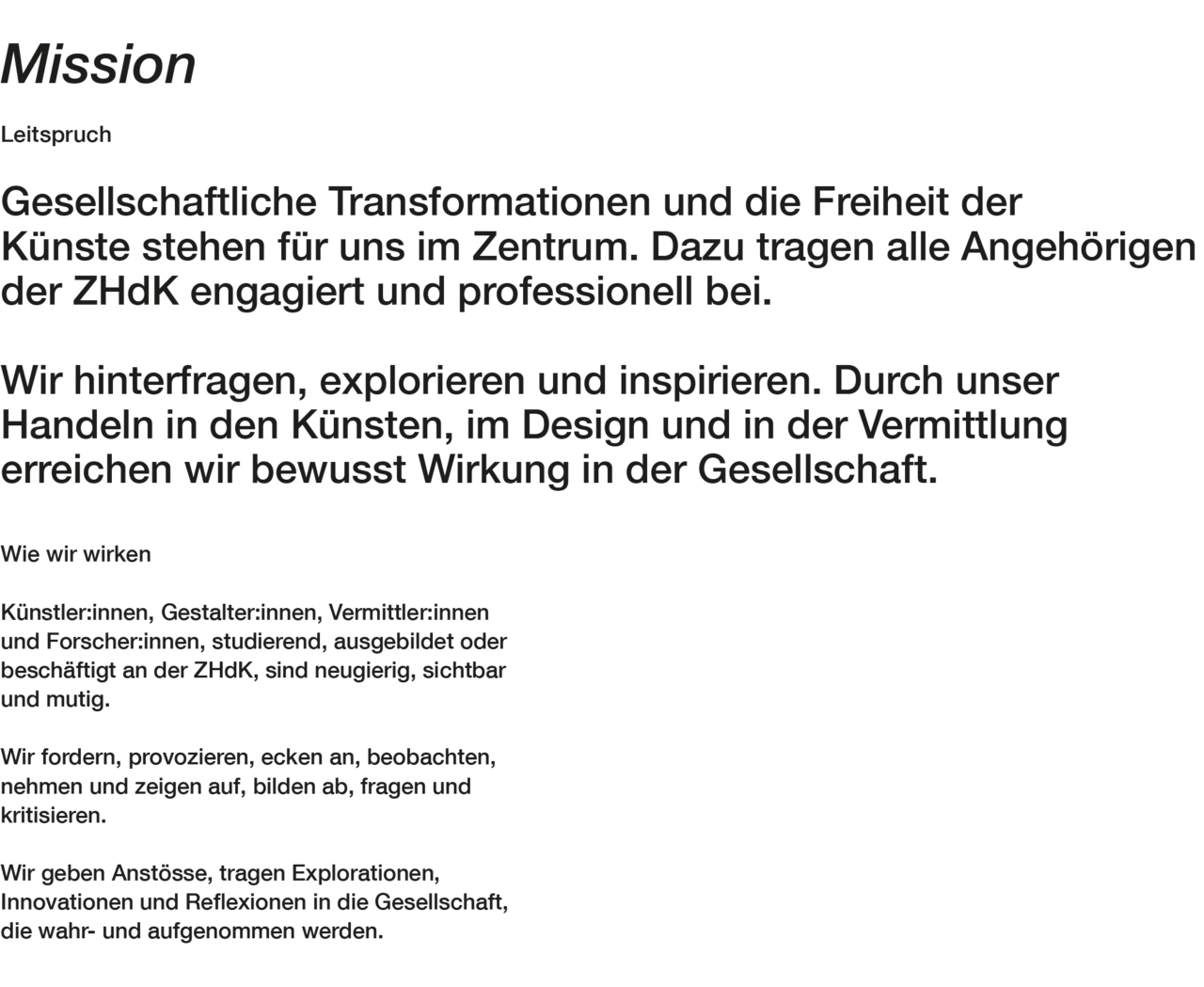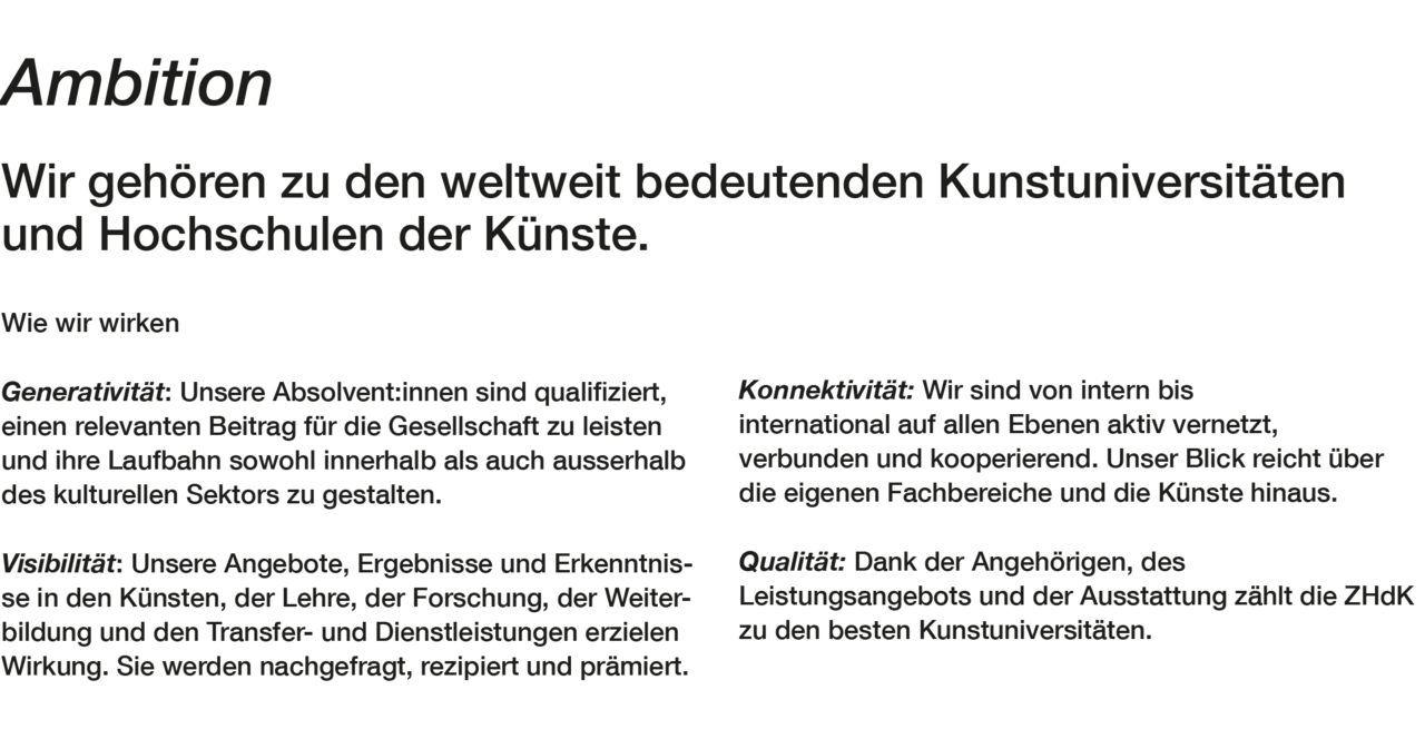 Die ZHdK vereinfacht mit klaren Verantwortlichkeiten die Organisation. Dies stärkt die Hochschule in ihren Kernaufgaben – Lehre, Forschung und Weiterbildung – und fördert die Exzellenz ihrer Studierenden und Mitarbeitenden, damit sie qualifiziert sind, einen gesellschaftsrelevanten Beitrag zu leisten und ihre Laufbahn sowohl innerhalb als auch ausserhalb des kulturellen Sektors zu gestalten.