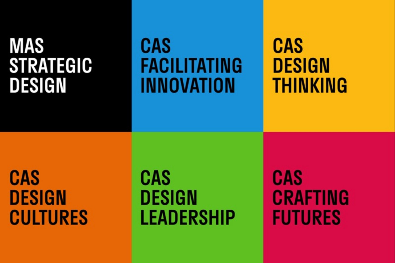 Die Grafik zeigt die Titel der sechs CAS-Programme im Portfolio des Weiterbildungsstudiengangs MAS Strategic Design an der ZHdK.