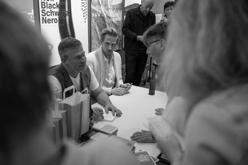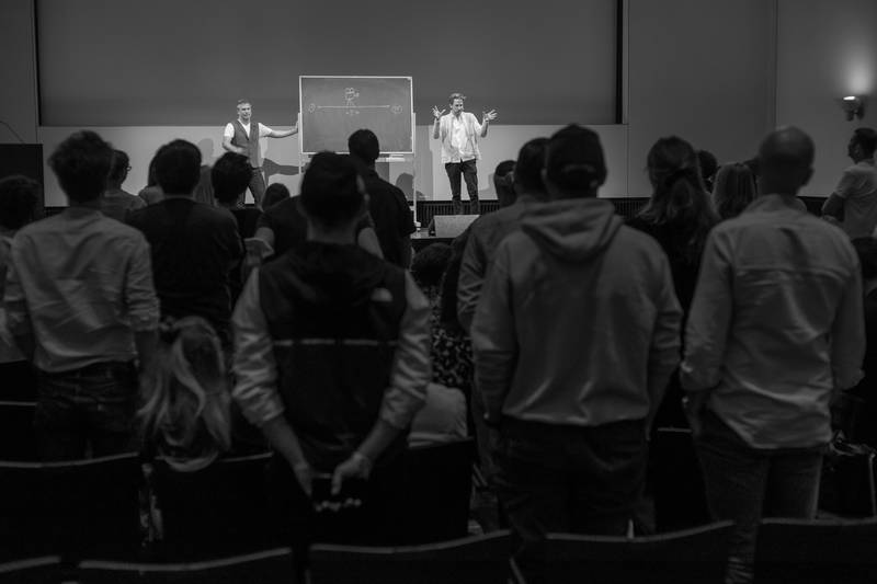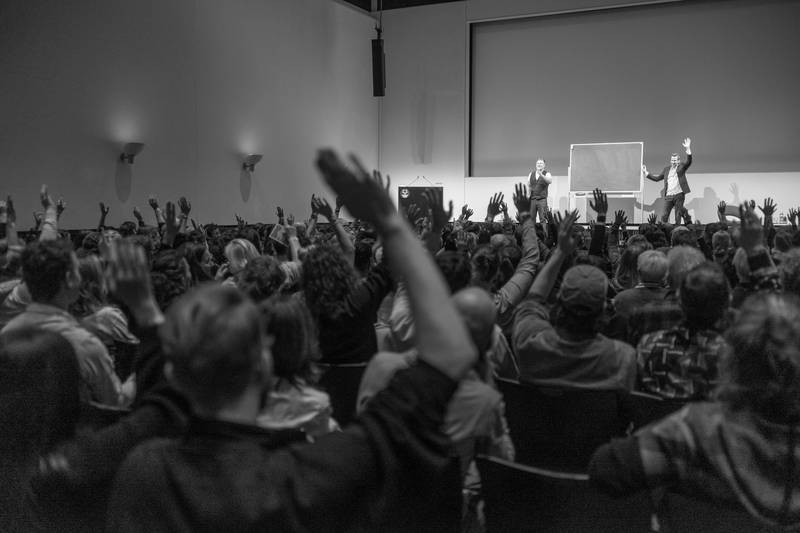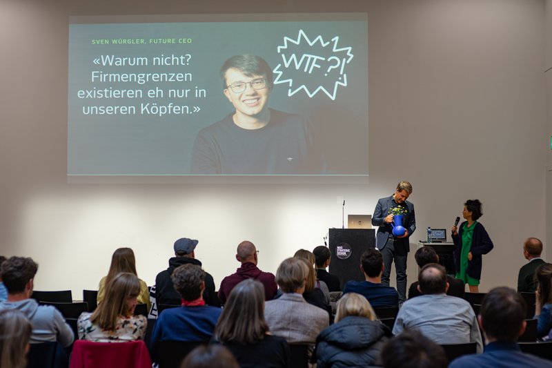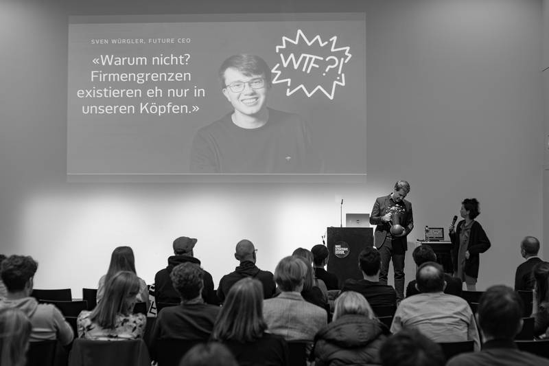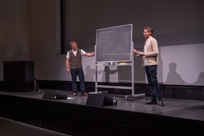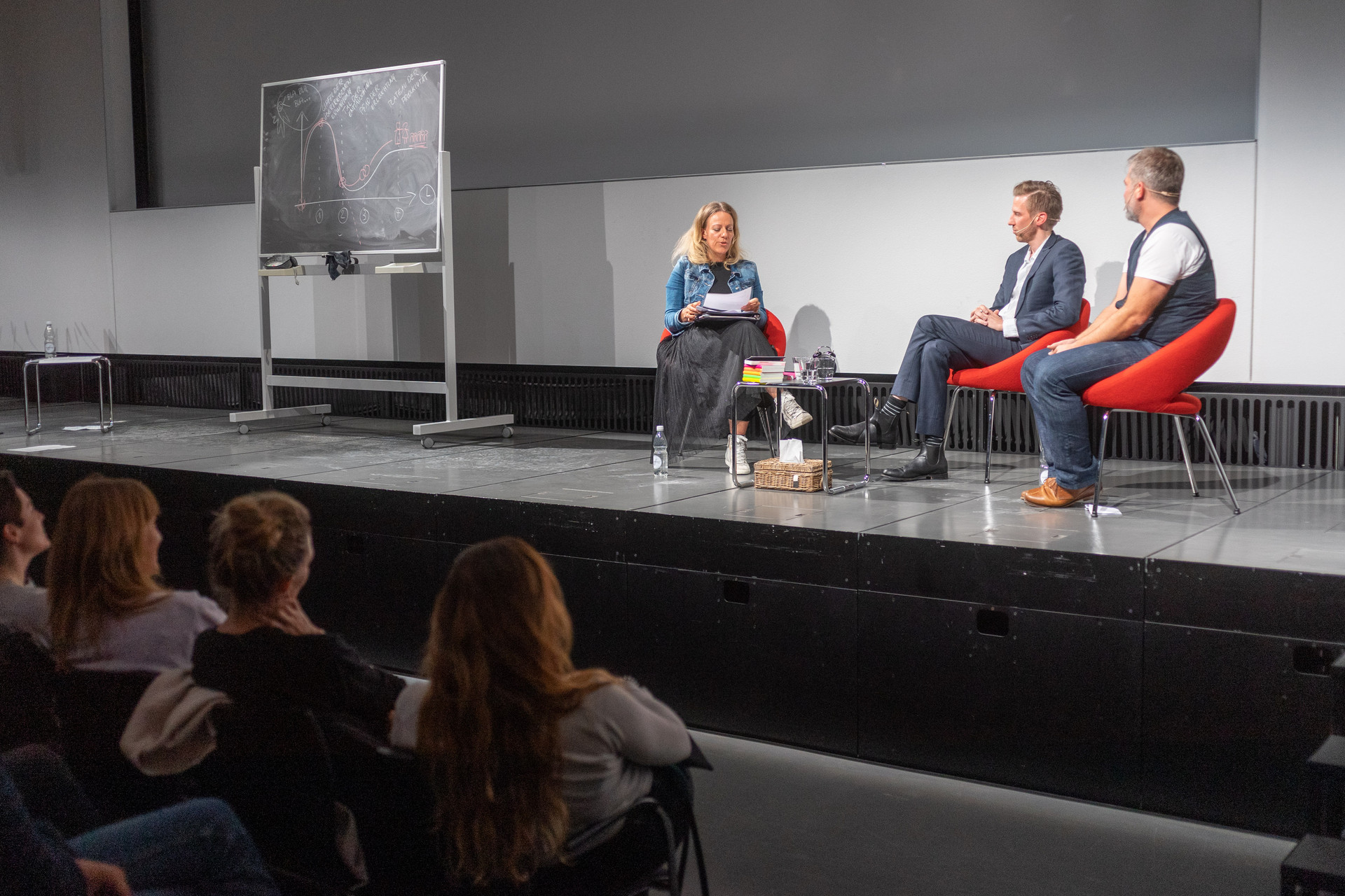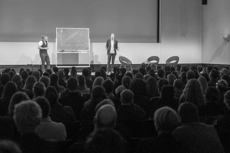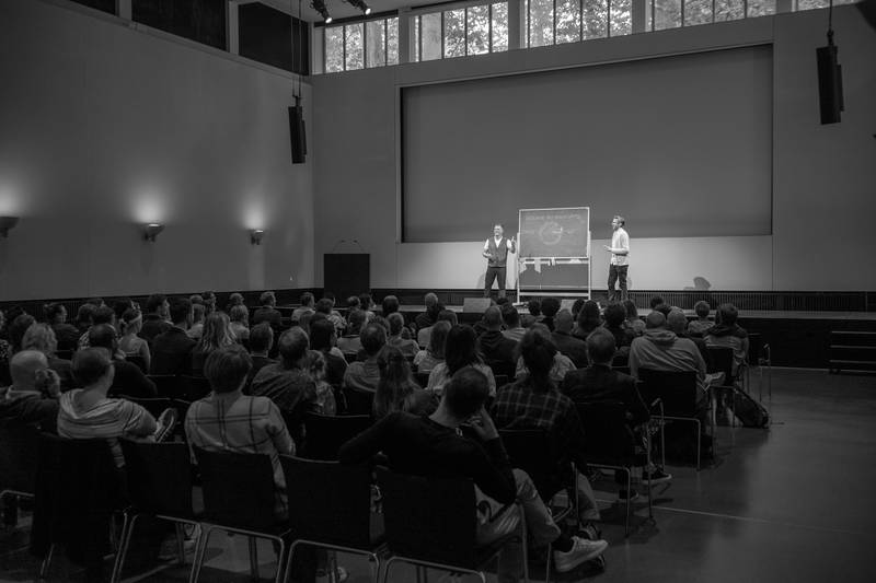 In ihrem Vortrag erklären die beiden die Welt des modernen Arbeitslebens und der Zusammenarbeit mit wenigen Strichen – an einer Kreidetafel. Im Anschluss legen sich die beiden Autoren auf die Couch und sprechen mit Felizitas Ambauen (Psychotherapeutin, «Beziehungskosmos») über Teamarbeit.